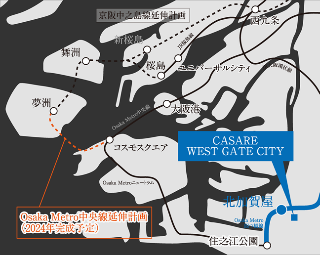 2024年度の開業を目指してOsaka Metro中央線が「コスモスクエア」駅から「夢洲」までの延伸計画(北港テクノポート線)が計画されています。これが実現すれば、「北加賀屋」駅から隣の「住之江公園」駅経由で南港ポートタウン線に乗り換え、「コスモスクエア」駅から「夢洲」へ快適にアクセスできます。