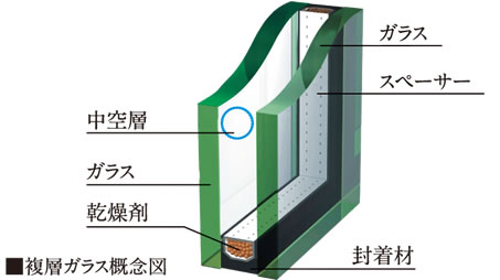 住まいの断熱性能を高め、快適性と省エネ性の向上を図るため、住戸の窓全てに複層ガラスを採用。2枚のガラス間に中空層を設けることで、熱が伝わりにくくなり、大きな断熱効果が得られます。