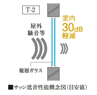 遮音性能を有するT-2グレード相当の防音サッシを採用、外部からの騒音を軽減しています。
