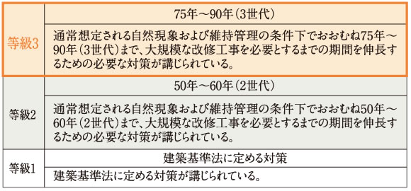 構造躯体等では「等級3」の劣化対策等級※を取得 (住宅性能表示制度による「設計住宅性能評価」等級) ※劣化対策等級とは構造躯体等に使用する材料の交換等の大規模な改修工事を必要とするまでの期間を伸長するための必要な対策の程度のことです。