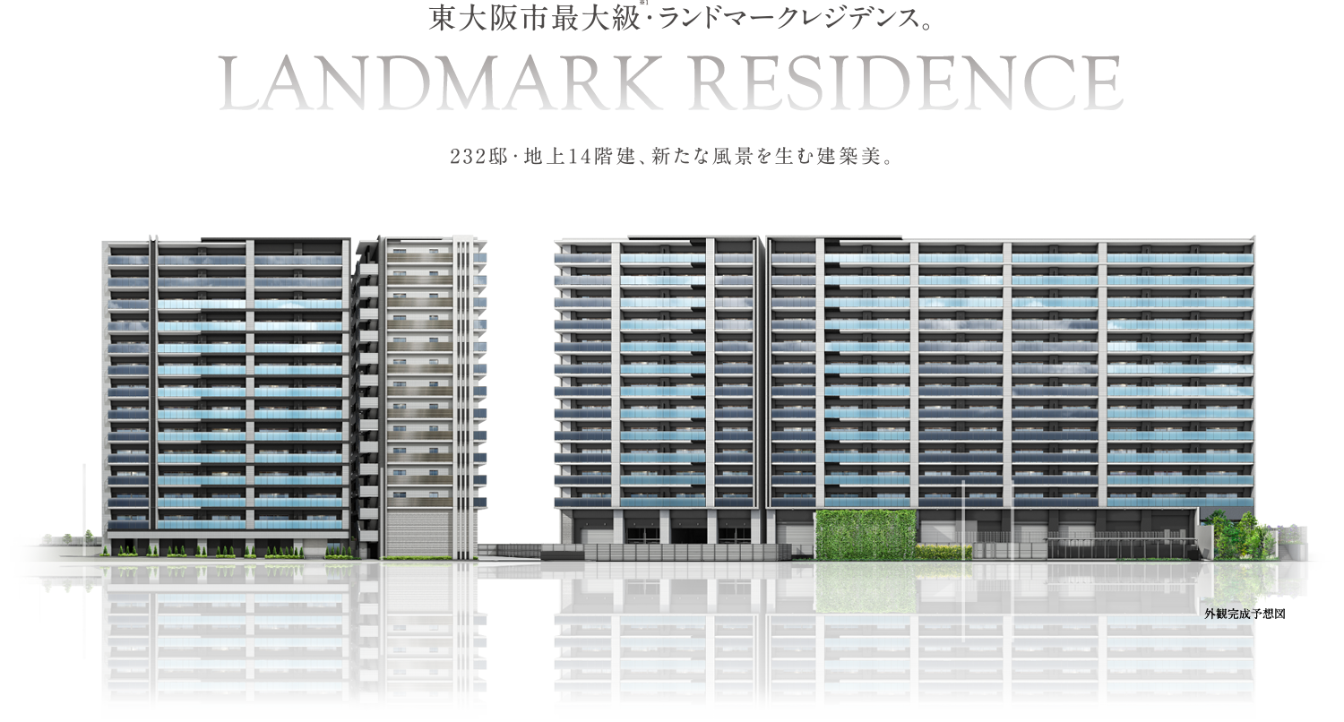 大規模レジデンスならではの存在感を放ちながらも、低層住宅の多い周辺環境に馴染むよう熟慮を重ねたデザイン。シックなアースカラーを基調に2棟の統一感を持たせ、敢えて共用廊下側にもガラス手摺を用いることで、どの方角から見ても洗練された佇まいとしました。ライン状のマリオンや雲の流れを感じさせる庇の段差などのアイキャッチを効果的に加え、印象を高めています。