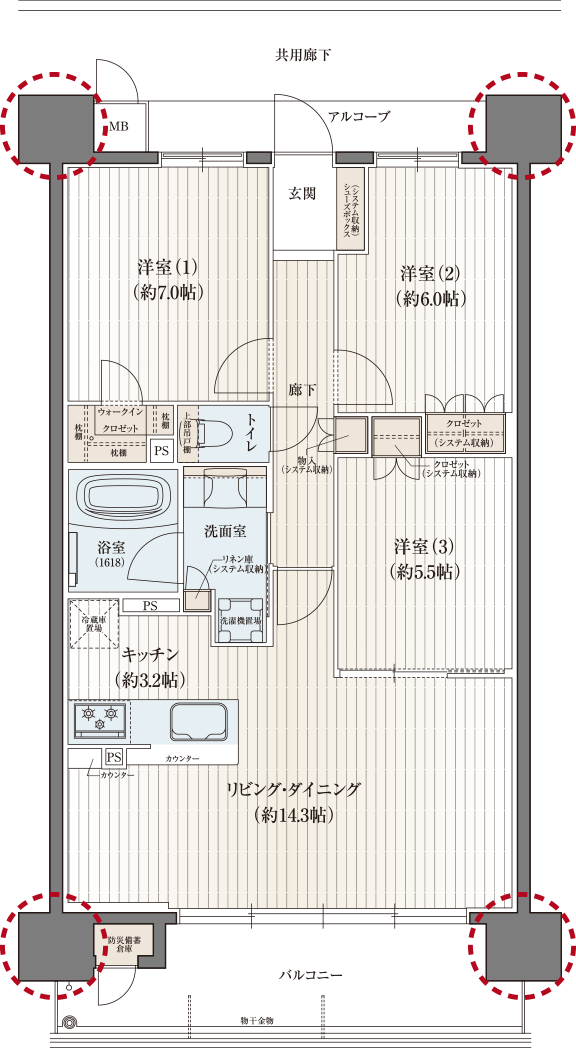 共用廊下側・バルコニー側の柱を外部側に出した、アウトポール設計。居住空間から、柱型によるデッドスペースを取り除き、家具等も配置しやすい、スッキリとした室内空間を実現しました。